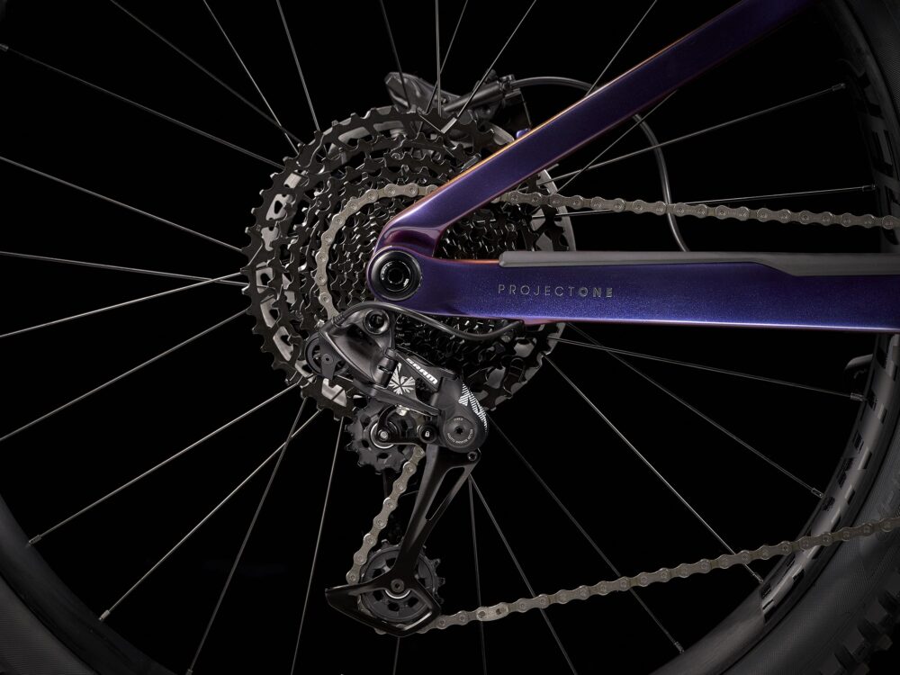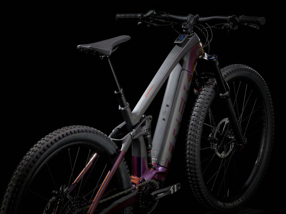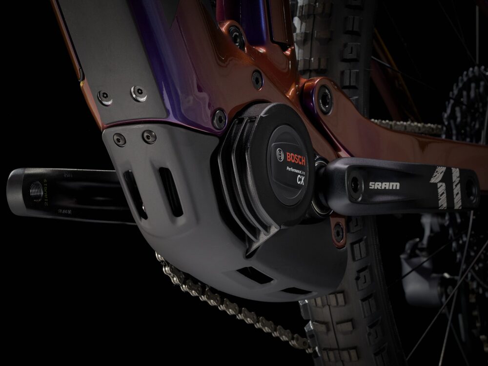 Cuadro de carbono OCLV Mountain con batería de 625 Wh completamente integrada, horquilla RockShox Yari RC de 160 mm, amortiguador RockShox Deluxe Select+ con 150 mm de recorrido, motor Bosch Performance Line CX de 250 W que permite alcanzar velocidades de hasta 25 km/h y consola Kiox. Transmisión SRAM NX Eagle 1×12, tija telescópica Bontrager Line, potentes frenos de 4 pistones para bajar con seguridad y ruedas Bontrager Line Comp 30 29er completamente preparadas para tubeless, con sellante incluido.