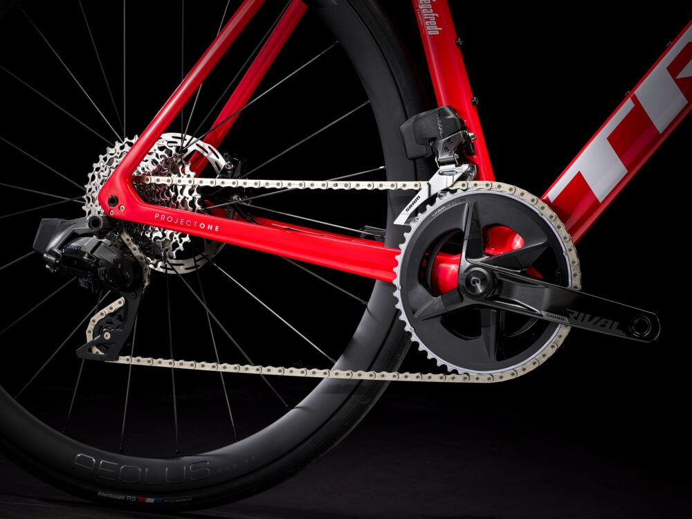 Cuadro de carbono OCLV Serie 800 aerodinámico y ultraligero por debajo de 700 gramos, una transmisión electrónica inalámbrica SRAM Rival AXS, potenciómetro Rival AXS, ruedas ligeras de carbono OCLV Bontrager Aeolus Pro 37 Tubeless Ready, un manillar/potencia aerodinámicos integrados de carbono OCLV Aeolus RSL, y potentes frenos de disco hidráulicos.