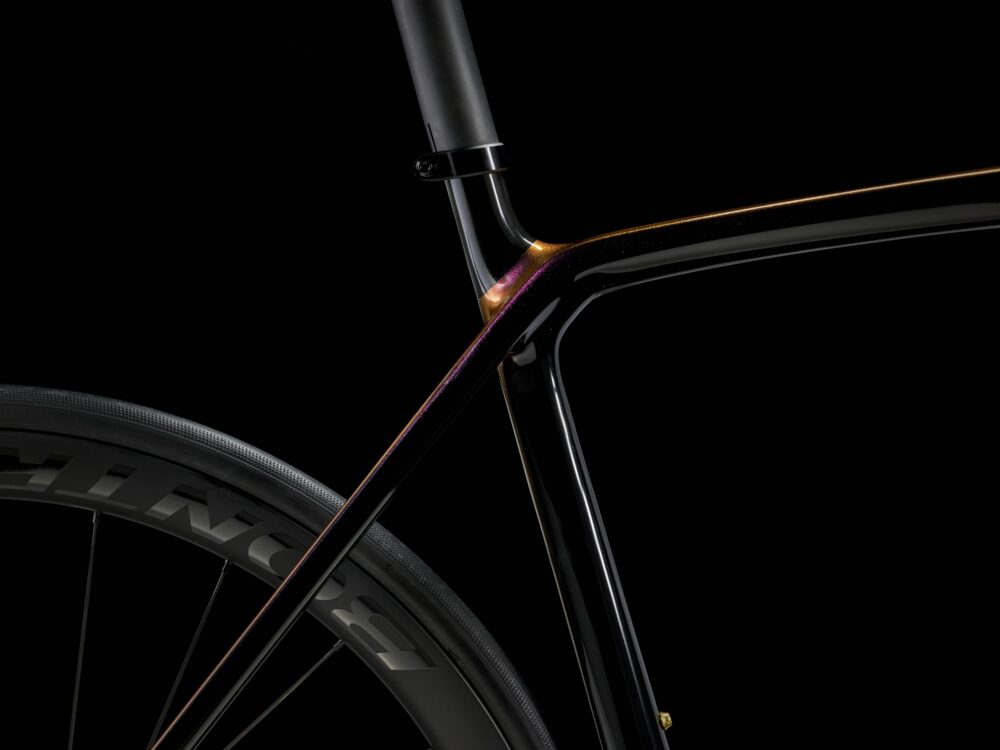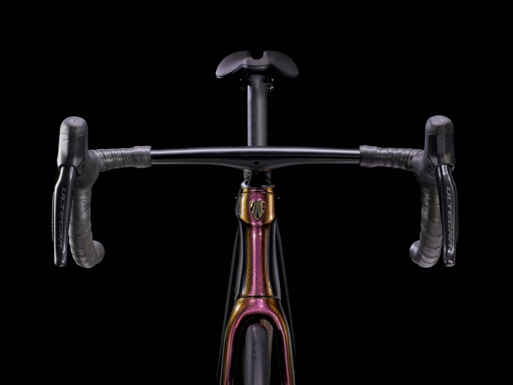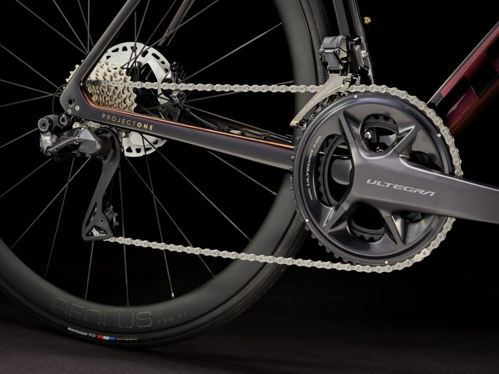 Cuadro excepcionalmente ligero y aerodinámico de carbono OCLV Serie 800 por debajo de los 700 gramos, horquilla íntegra de carbono, nueva transmisión electrónica inalámbrica Shimano Ultegra Di2 2×12, ruedas ligeras Bontrager Aeolus Pro 37 de carbono OCLV tubeless ready, sistema de manillar y potencia aerodinámico integrado Aeolus RSL de carbono OCLV y potentes frenos de disco hidráulico.