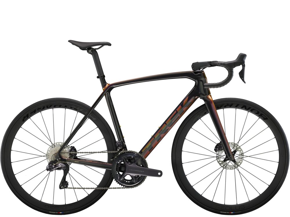 Cuadro excepcionalmente ligero y aerodinámico de carbono OCLV Serie 800 por debajo de los 700 gramos, horquilla íntegra de carbono, nueva transmisión electrónica inalámbrica Shimano Ultegra Di2 2×12, ruedas ligeras Bontrager Aeolus Pro 37 de carbono OCLV tubeless ready, sistema de manillar y potencia aerodinámico integrado Aeolus RSL de carbono OCLV y potentes frenos de disco hidráulico.