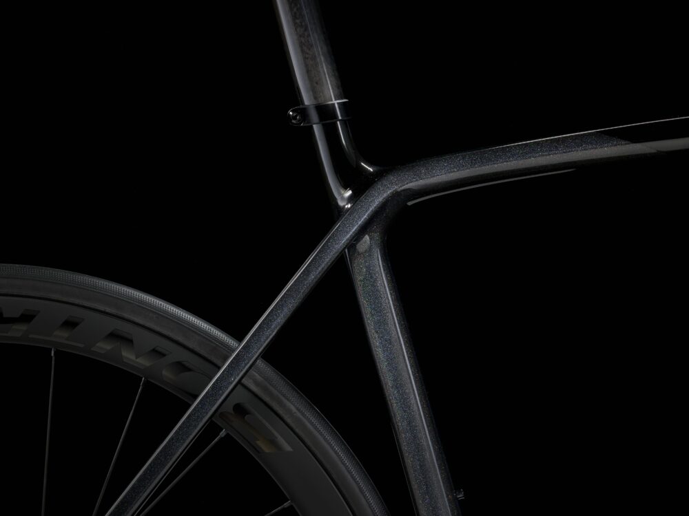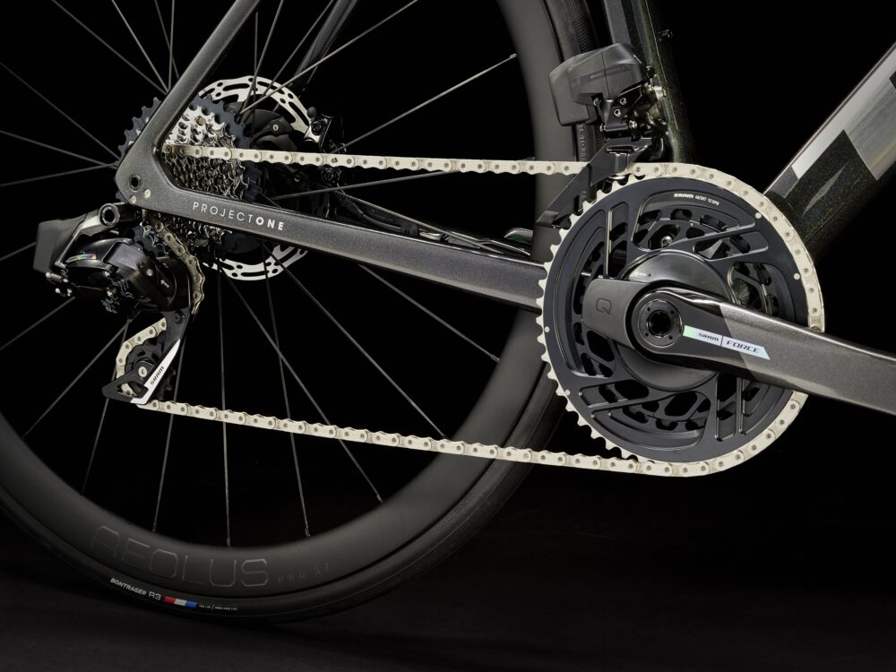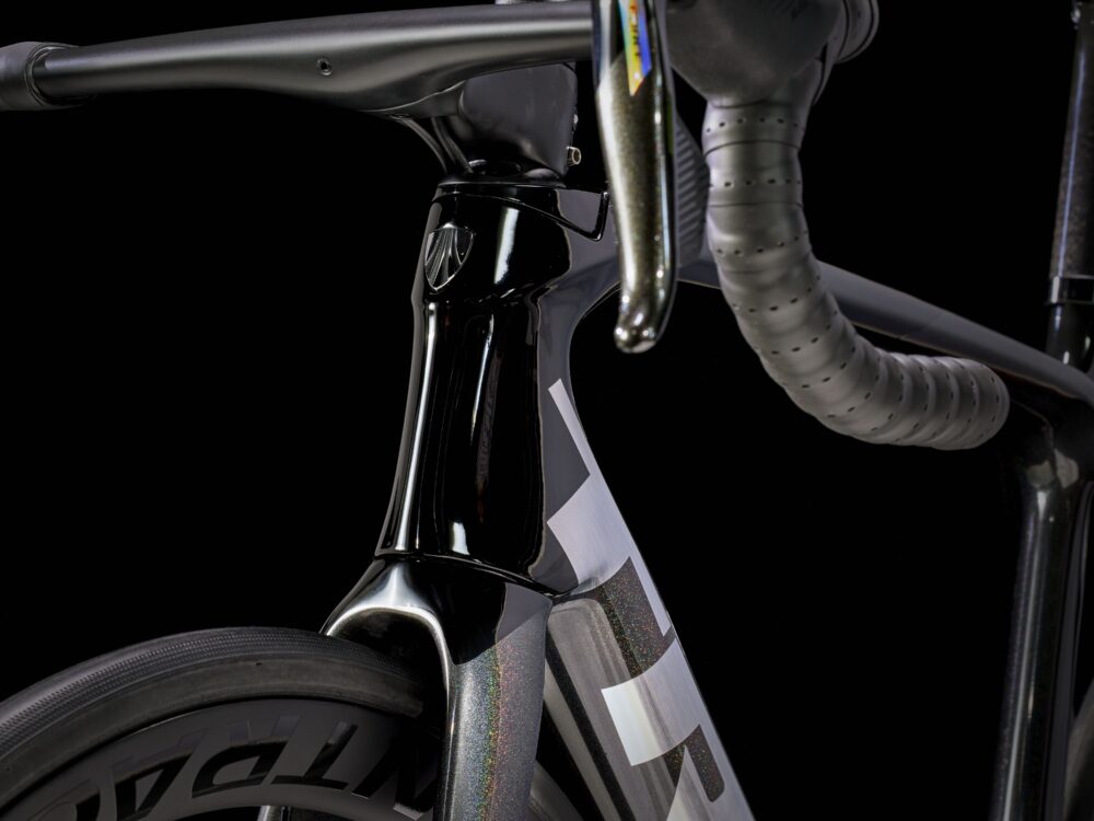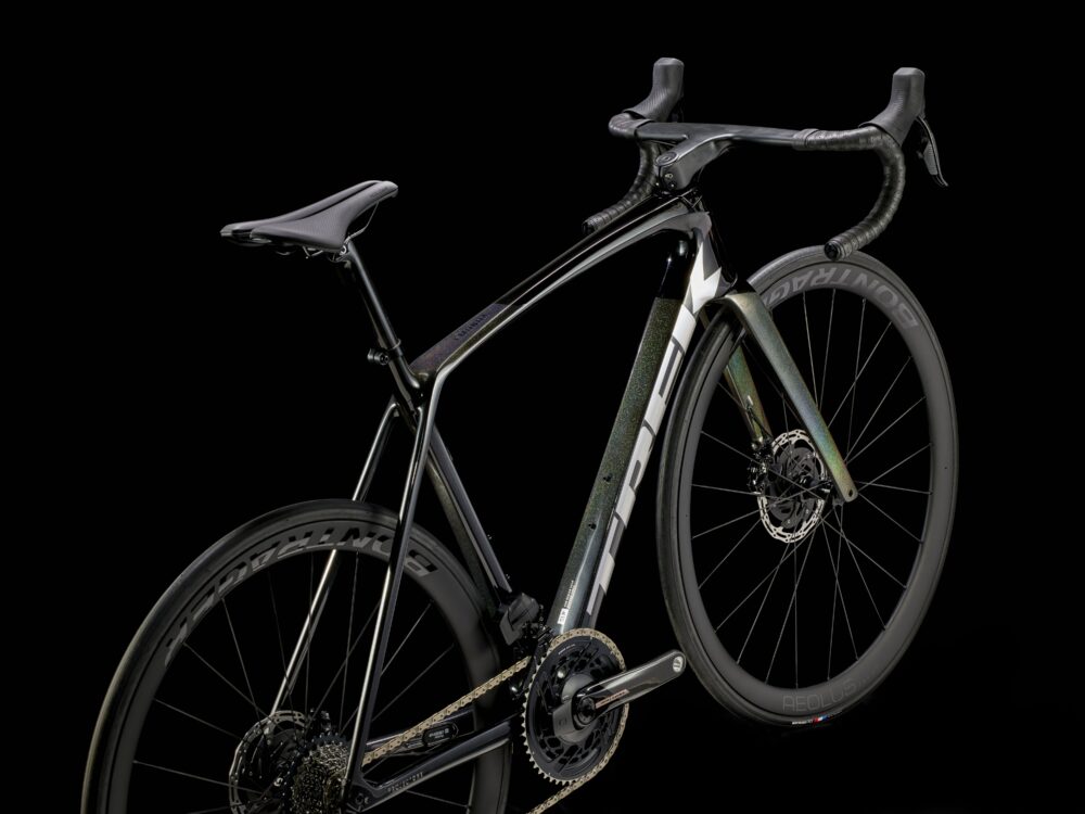 Cuadro de carbono OCLV Serie 800 aerodinámico y ultraligero por debajo de 700 gramos, transmisión electrónica inalámbrica SRAM Force AXS D, ruedas ligeras de carbono OCLV Bontrager Aeolus Pro 37 Tubeless Ready, un manillar/potencia aerodinámicos integrados Aeolus RSL de carbono OCLV, medidor de potencia SRAM Force AXS y potentes frenos de disco hidráulicos.