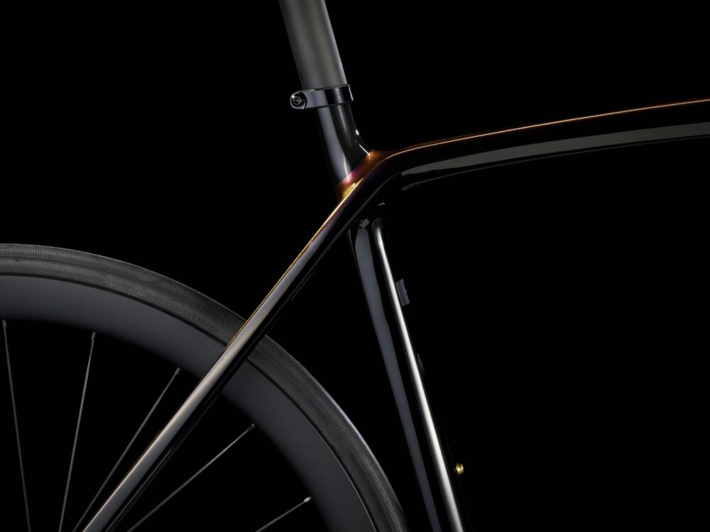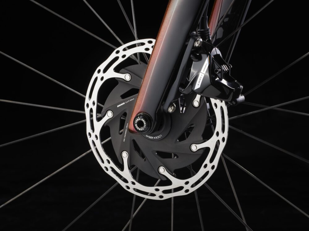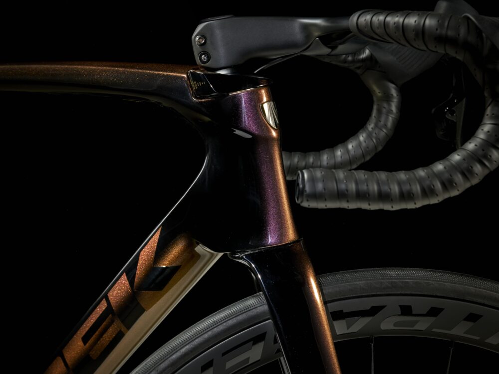 Cuadro de carbono OCLV Serie 800 aerodinámico y ultraligero por debajo de 700 gramos, transmisión electrónica inalámbrica SRAM Force AXS D, ruedas ligeras de carbono OCLV Bontrager Aeolus Pro 37 Tubeless Ready, un manillar/potencia aerodinámicos integrados Aeolus RSL de carbono OCLV, medidor de potencia SRAM Force AXS y potentes frenos de disco hidráulicos.