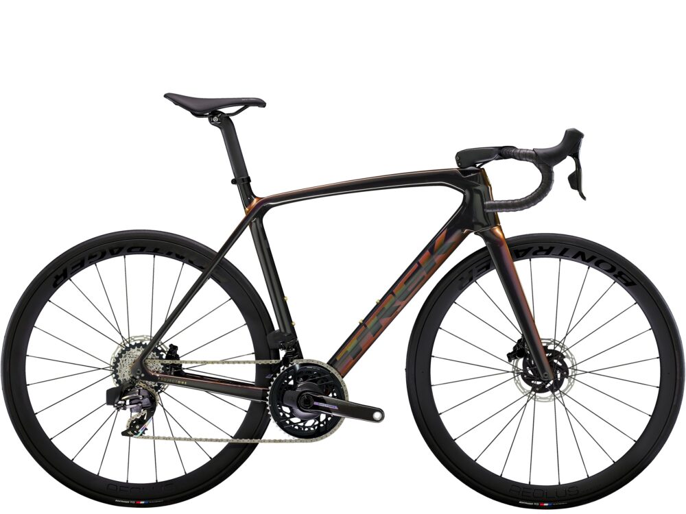 Cuadro de carbono OCLV Serie 800 aerodinámico y ultraligero por debajo de 700 gramos, transmisión electrónica inalámbrica SRAM Force AXS D, ruedas ligeras de carbono OCLV Bontrager Aeolus Pro 37 Tubeless Ready, un manillar/potencia aerodinámicos integrados Aeolus RSL de carbono OCLV, medidor de potencia SRAM Force AXS y potentes frenos de disco hidráulicos.