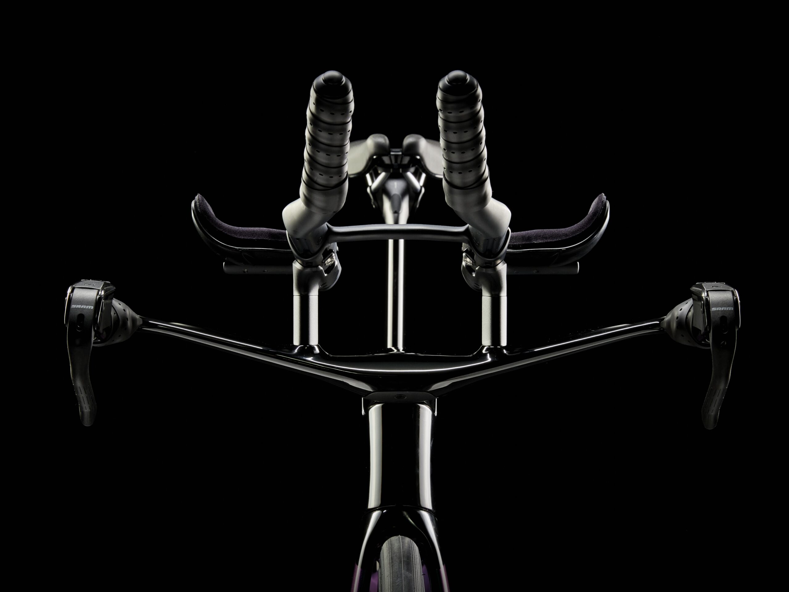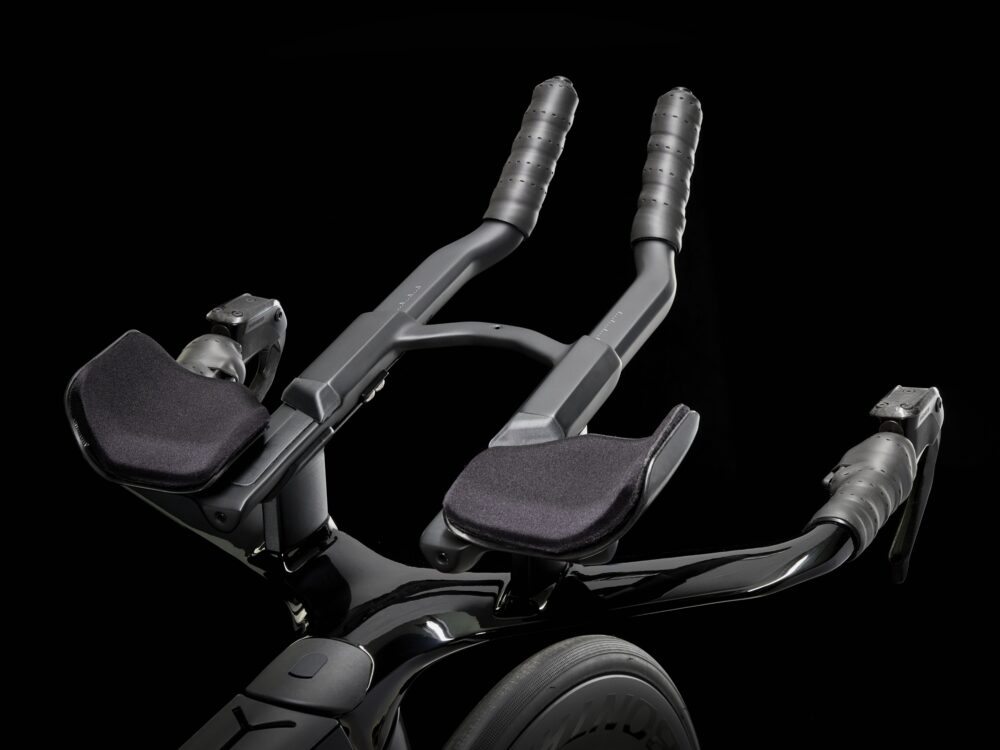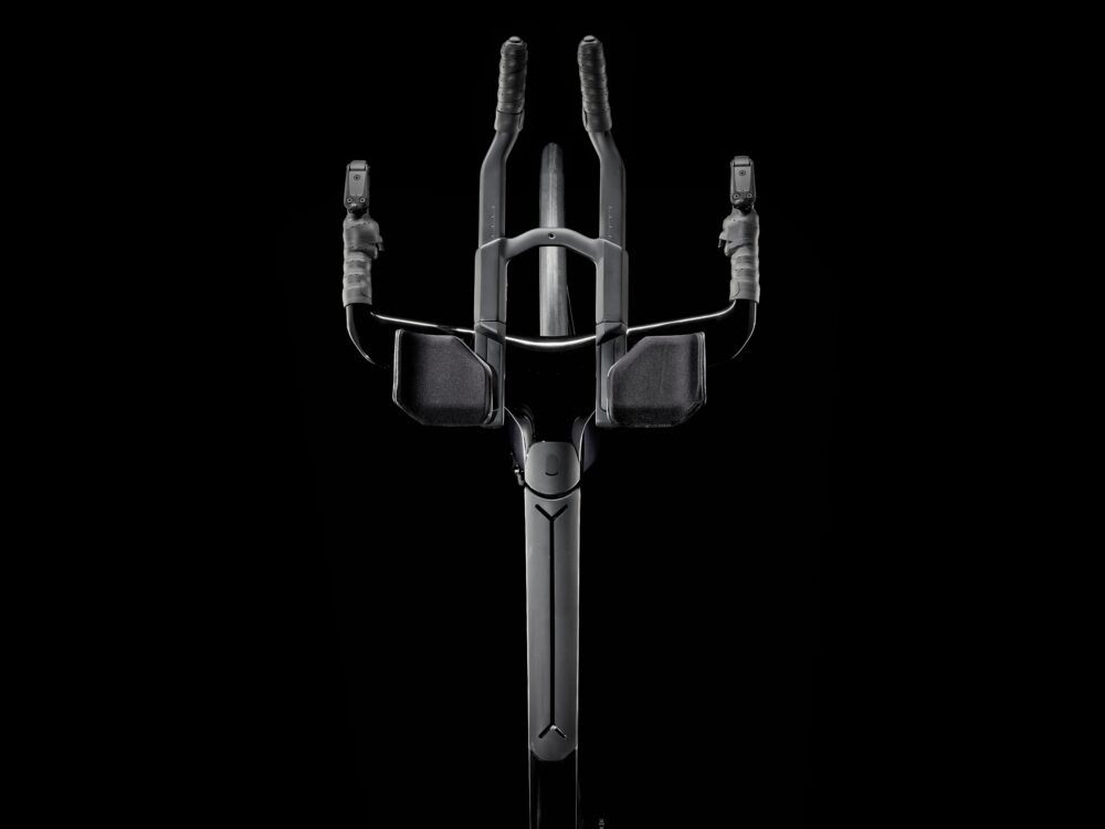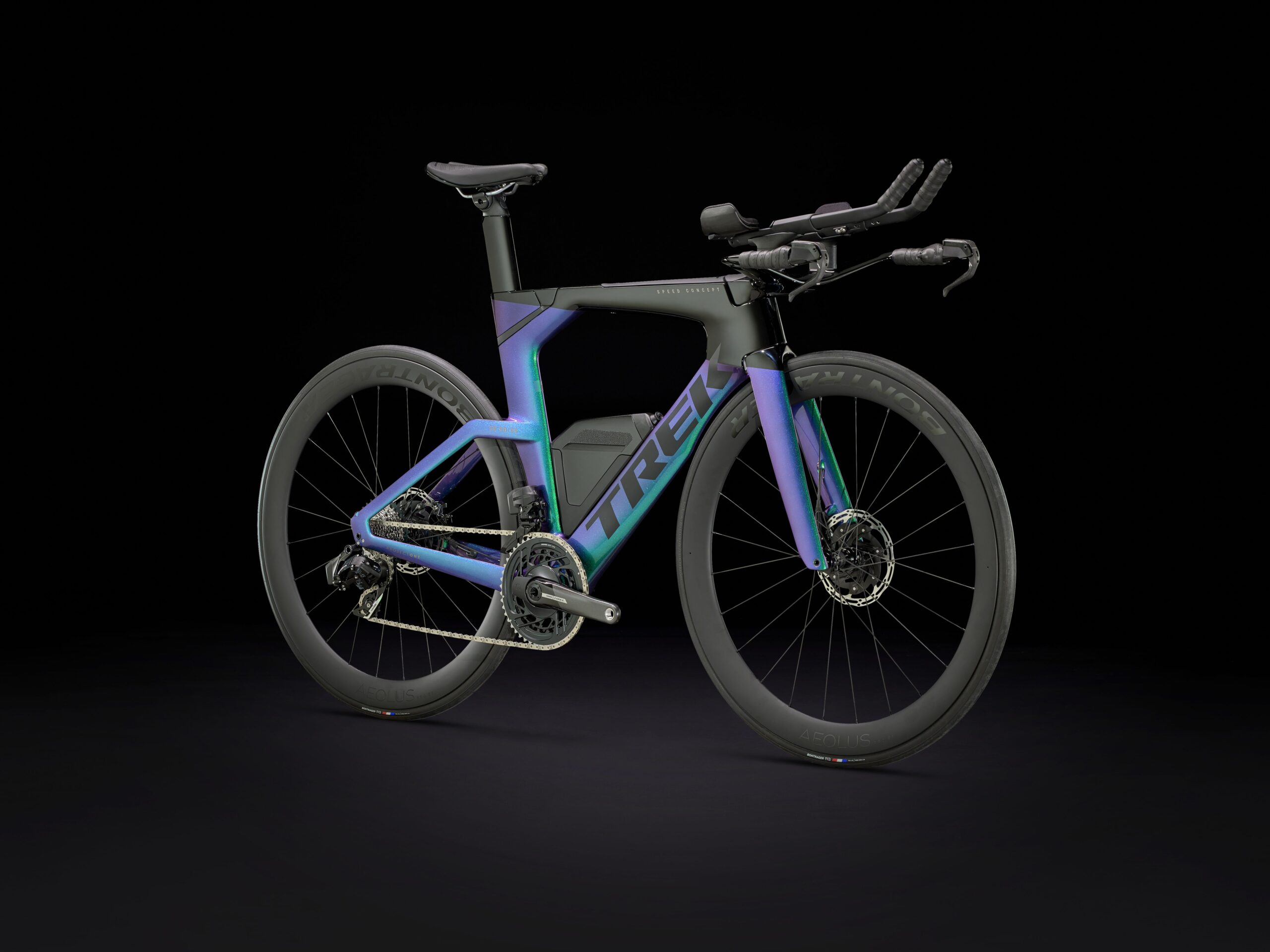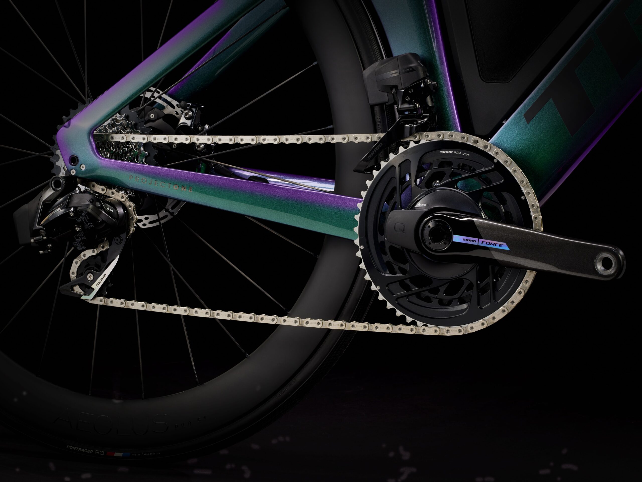 Cuadro ultraligero de carbono OCLV Serie 800, tubos con diseño Kammtail Virtual Foil (KVF) que reduce la resistencia, horquilla aerodinámica íntegra de carbono Speed Concept, IsoSpeed, almacenamiento aerodinámico e integrado para comida, hidratación y kit antipinchazos, transmisión electrónica inalámbrica SRAM Force AXS D2 de 12 velocidades con manetas de cambio SRAM AXS Clics, medidor de potencia Force AXS, potencia y manillar completamente integrados, sillín Bontrager Hilo Comp específico de triatlón que permite adoptar una postura aerodinámica agresiva, frenos de disco para una potencia de frenada fiable y ruedas de carbono O
